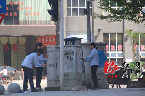 在街头巷尾到处可以看见干部职工们忙碌的身影,他们不怕脏不怕累,认真的打扫着路面的垃圾,他们舞动着手里的铁铲和刷子努力的清理着电线杠上墙壁上的牛皮鲜小广告。只见他们挽起衣袖,几人一起合力清除这些影响环境美观的垃圾,干劲十足。有些贴在高处的小广告难以清除,工作人员二话不说爬上楼梯进行清理。三蓝社区工作人员彭敦葵告诉,搞卫生就是美化环境,环境好了人的心情也好了,老百姓也喜欢。