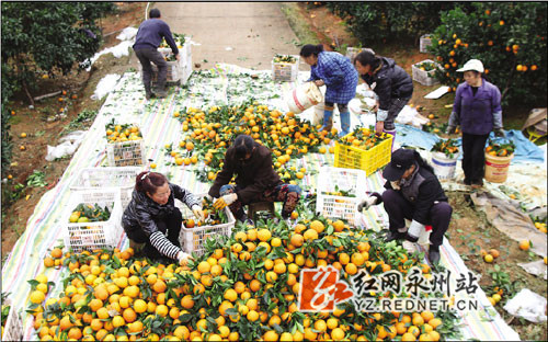 自2006年以来,道县因地制宜,引导扶持库区移民发展脐橙产业脱贫。目前,全县库区优质脐橙产业发展壮大到近8万亩,成为7万多移民增收致富的主导产业,走出了一条移民扶贫由“输血型”向“造血型”转变的产业扶贫新路子。图为12月3日村民在采摘脐橙。 (何红福 欧阳维动 摄)