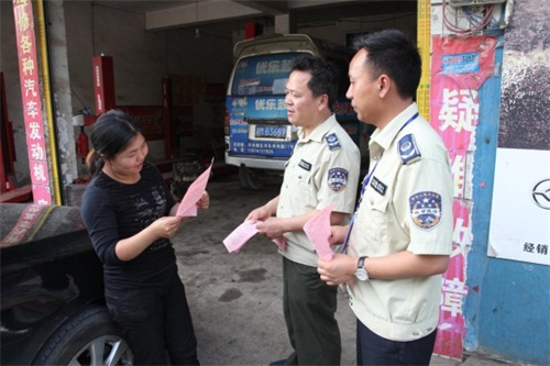 图为城管队员正在某汽车修理店对占道修车行为进行政策宣传和劝说。