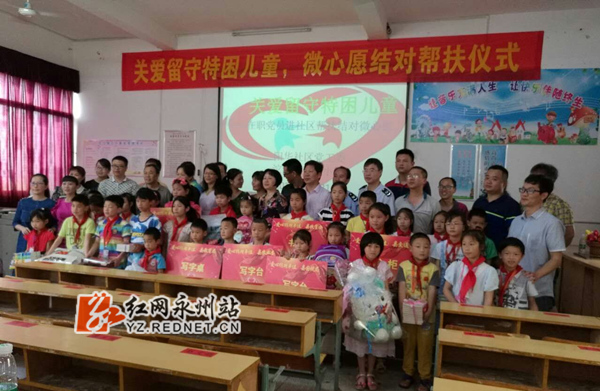 红网永州站6月1日讯(通讯员 蒋勇胜 王志辉)5月31日,江华县地税局组织机关支部、稽查局支部23名在职党员深入江华县沱江镇二小,开展“关爱留守特困儿童,结对帮扶微心愿——在职党员进社区自愿服务” 活动。23名江华地税在职党员与30多名在六一儿童节来临之际许下心愿的留守特困儿童学生一一结对,并根据这些留守特困儿童学生的微心愿,将凝聚着地税党员干部爱心的书桌(柜)、书包、图书、文具等文化学习用品,一一送到这30多名儿童的手中,完成了他们的微心愿,并陪伴他们共同过了一个非常有意义的儿童节。