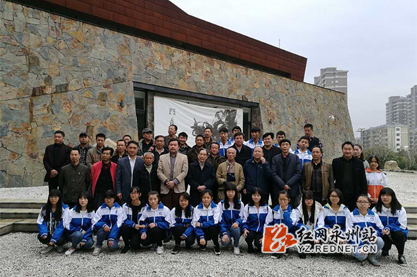 从北京远道赶来的泼彩焦墨画家、全球公益联盟艺术骑士金质勋章获得者(2015年)蔡印龙,在感受九疑山风景和文化底蕴后,在舜德书院创作室用半天时间完成了巨幅红色泼彩画《江山如此多娇》。书画专业人士和普通中学来的艺术爱好者进行了艺术交流。