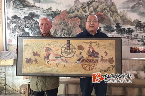 画家刘双全(左)乐见舜帝南巡组图原稿陈展于舞德书院