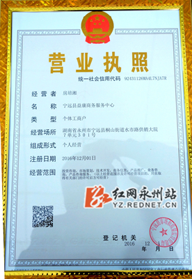 红网永州站12月1日讯(通讯员 黄建军 徐艳)12月1日是全国个体工商户“两证整合”推广第一天。当日,宁远县市监局在城南分局办证大厅现场为个体工商户房培湘颁发全县首张“两证整合”营业执照,标志着从即日起,个体工商户“两证整合”登记制度在该县全面实施。