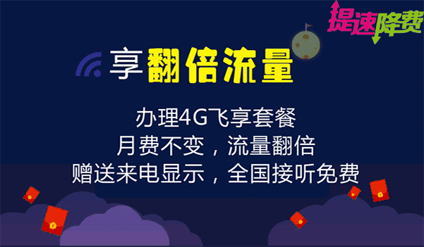 还在为每个月流量不够用,长途漫游费而发愁?提速降费,超值套餐。全国被叫免费 长市漫一口价,更享翻倍流量,花更少钱用更好4G。