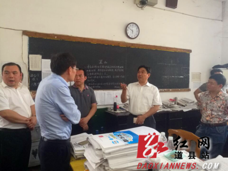 红网道县分站5月27日讯(通讯员 何云飞 周兆湘 谭诚)5月26日下午,湖南省道县县委副书记、县长李天明率队先后深入道县补习学校、永州工贸学校、道县一中、道县二中看望全体高三师生,检查高考前各项准备工作情况,为高三全体师生加油鼓劲。道县县委副书记蒋燕飞,副县长林志刚,道县教育局局长陈林静等参加检查工作。
