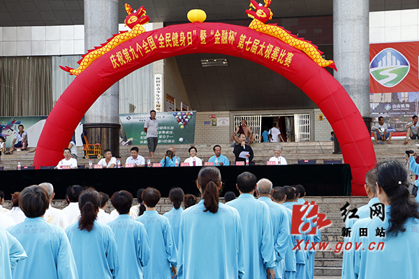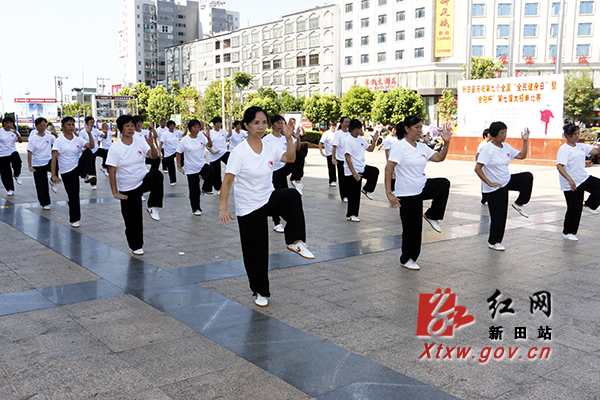 红网新田县分站8月6日讯(记者 钟伟锋)8月5日上午,湖南省新田县庆祝第九个“全民健身日”暨“金融杯”第七届太极拳比赛在县文体中心广场举行,全县500余名太极拳爱好者在此集中展示太极技艺,庆祝全民健身日。