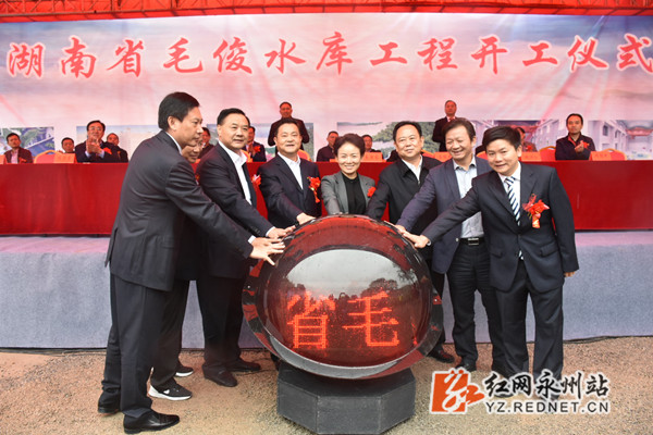 出席湖南省毛俊水库开工仪式的领导共同触摸启动球。