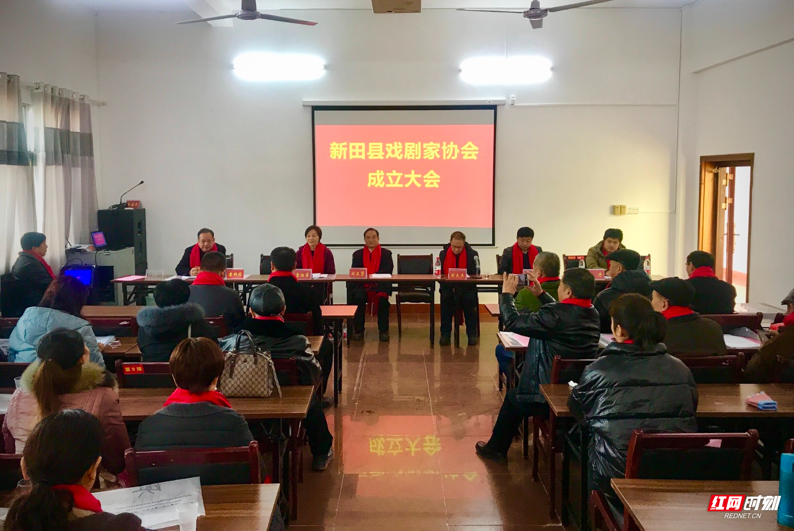 新田县戏剧家协会的前身是永州市京剧协会新田分会,2014年成立以来,以传承、发扬、创新国粹京剧艺术为己任,潜心创作,精心排练,认真演出,举办了一系列活动。协会参加了湖南省第六届票友艺术节、永州市一至五届艺术节,创作了《披枷祈雨》《三卖田庄》《接风宴》《风雪瑶山》《陈运周》等优秀的京剧剧目,获湖南省第六届艺术“先进票房奖”,在中央电视台多个频道进行报道播出。创作的《扶贫路上》《八千》《配合》《新田是我家》等小品,寓意深远,获得社会各界好评。