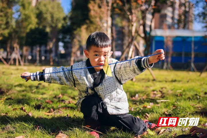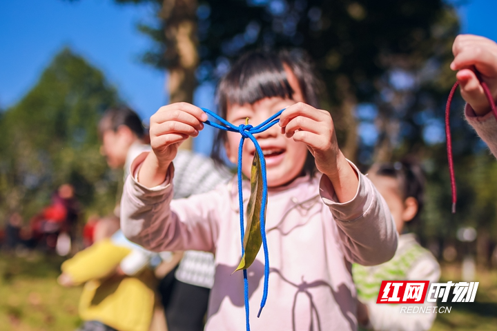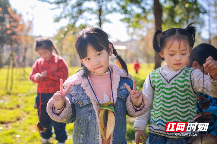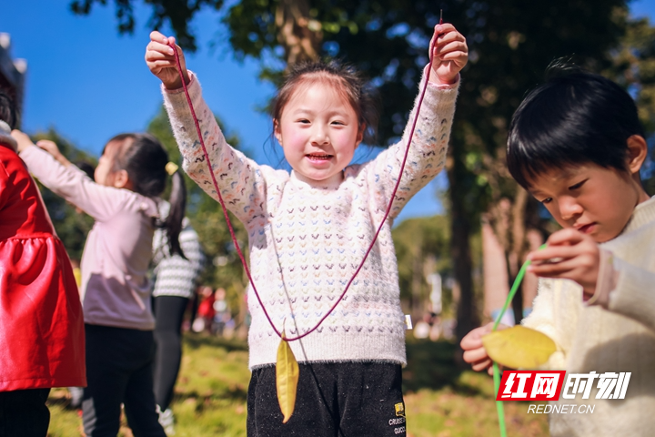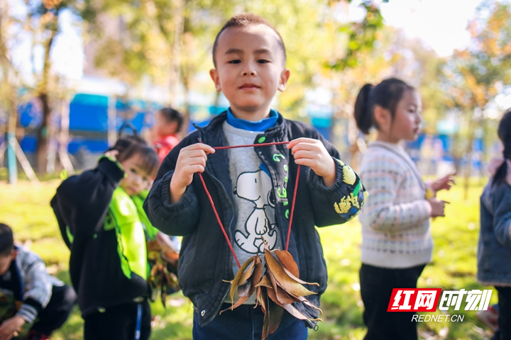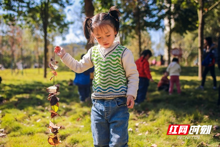 当日,蓝山县一家幼儿园开展自然科学教育,把手工课堂搬进大自然,小朋友们在老师的指导下,收集一片片各种颜色、形态的落叶,通过稚嫩的小手,制作成一件件妙趣横生的手工饰品,在动手学习的过程中亲近自然,感受季节之美。
