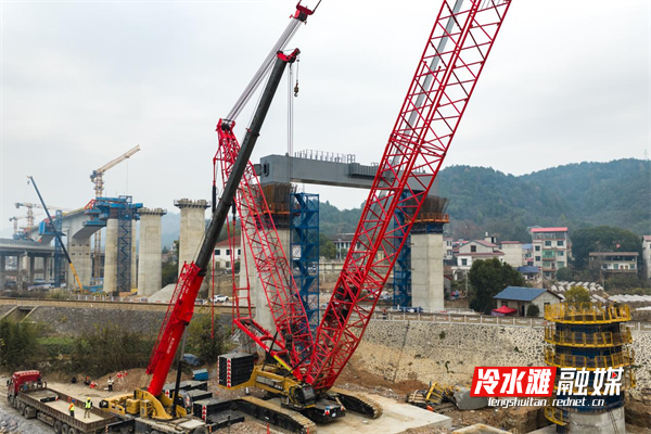 跨芦洪江特大桥全长3050.955米,需跨越高速、铁路、省道及河流,是邵永高铁全线的重点难点工程之一。此次架设的钢盖梁位于26号墩段,采用26米跨度门式墩构造跨越既有益湛铁路,吊装重量达209.8吨,具有吊装吨位大、作业半径广、吊装高度高、施工时间紧、施工难度大、安全风险高的特点。建设单位通过开展安全风险研判、设计优化和技术交底,最终采用650吨履带吊起钢盖梁,逆时针旋转117度后,与门式墩精准对位,一次性顺利完成吊装作业。