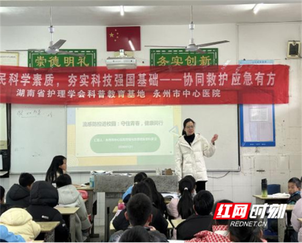 红网时刻新闻1月26日讯(通讯员 肖潇 荆晓熠)为加强校园流感防控工作,提升师生健康防护意识与自救互救能力,永州市中心医院呼吸与危重症医学科团队走进朱家山小学,开展了一场主题鲜明、内容实用的流感防控知识宣讲与急救技能培训活动。