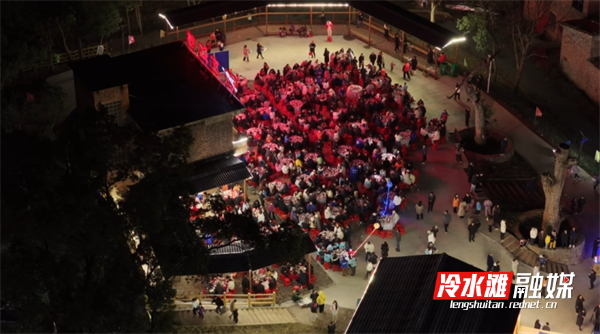 当晚,活动迎来高潮——一百余桌汇聚永州风味的盛宴正式开席。桌上既有传统杀猪菜、东安鸡、血鸭等地道硬菜,也有各家各户拿手的家常风味,一道道菜肴热气蒸腾,满载着龙江桥村民的谢意与祝福。本地群众、外来游客、外地企业家代表等围坐一堂,在杯盏交错、欢声笑语中共话情谊,共叙未来。
