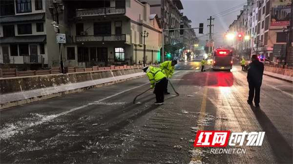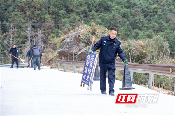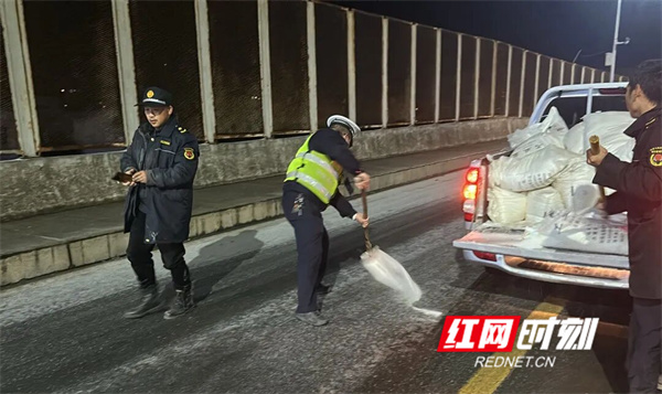 1月21日上午,宁远县公安局五龙山派出所得知辖区部分村庄的路段出现路面结冰情况,车辆无法通行。民警立即联合乡镇工作人员,携带工业盐及铲雪工具赶赴牛塘岭村、上庄源村等地,对结冰路段实施撒盐除冰作业,全力保障道路交通安全畅通。