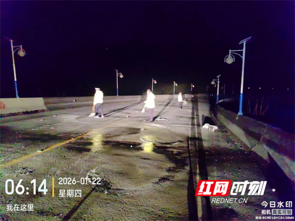 受低温天气影响,1月22日上午,祁阳市杨梅湖大桥桥面出现结冰,存在交通安全隐患。为确保行车安全,祁阳交警立即对该桥实施临时交通管制,禁止车辆通行,并引导过往车辆绕行指定路线。目前,交警已在桥面及周边路段设置警示标志,并现场指挥疏导过往车辆,耐心答疑驾驶员咨询。