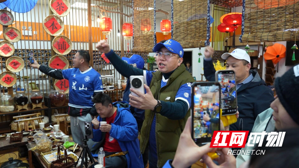 江永文旅工作人员杨丽举起女书扇面说:“正面‘永吴同心’,背面‘潇湘传情’——我们潇湘子弟把这份滚烫的热情,借小小扇面递给江苏的网友和球迷。”