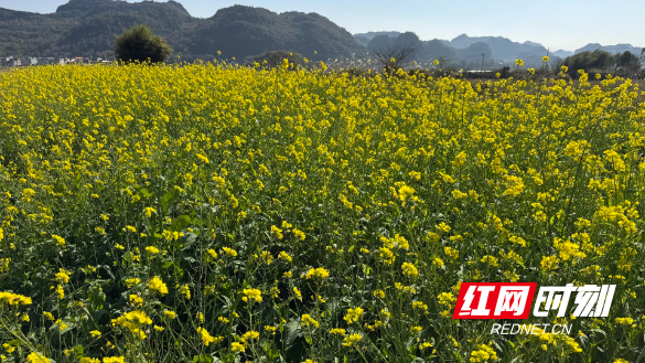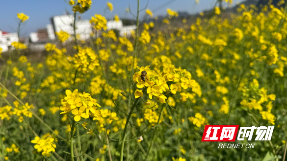 在江永县潇浦镇的油菜地里,嫩绿的茎秆上托起朵朵金黄的油菜花,阳光洒下,花瓣闪耀着温暖的光泽。成群的蜜蜂在花丛中往来穿梭,嗡嗡作响,不仅为冬末增添了灵动气息,也预示着今年油菜的好长势。