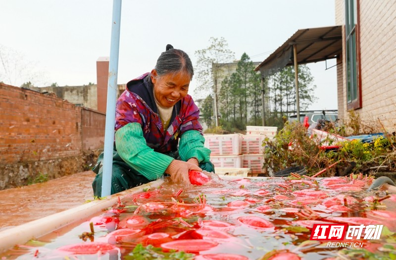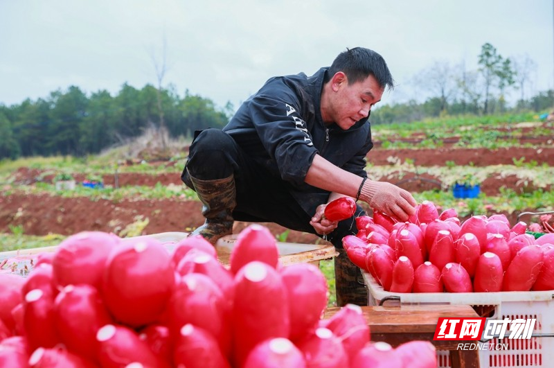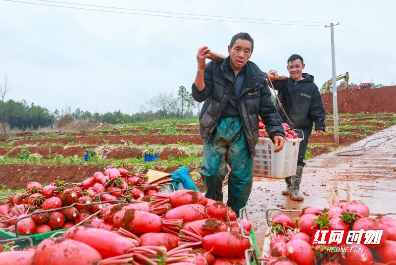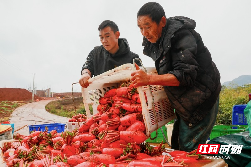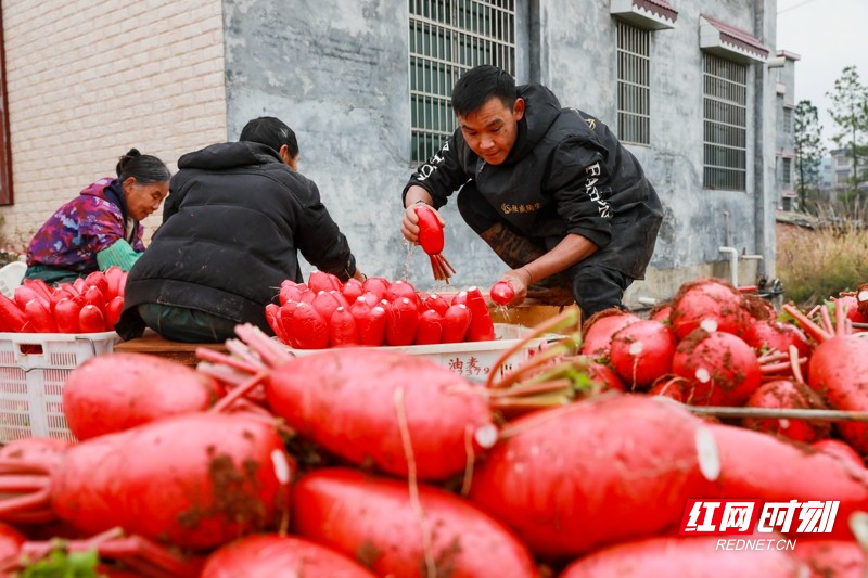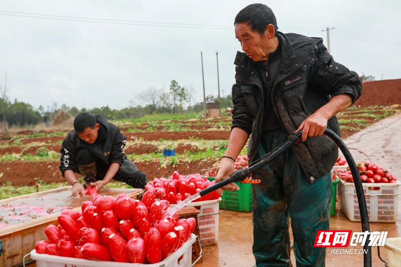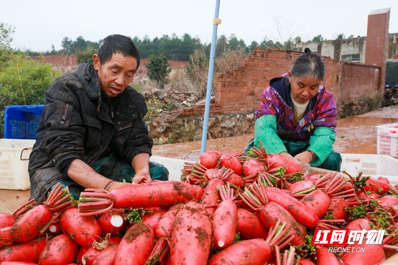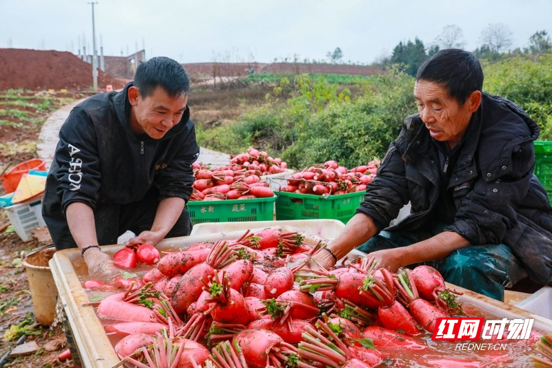 红网时刻新闻1月5日讯(通讯员 刘贵雄 陈祉凝)1月5日,湖南省永州市新田县骥村镇陆家村,村民在采收清洗红皮萝卜准备外销。小寒时节,湖南省新田县种植的红皮萝卜喜获丰收,当地村民抓紧采收外销粤港澳大湾区蔬菜市场,田间地头一派繁忙景象。近年来,湖南省新田县以土地富硒资源优势为依托,积极对接粤港澳大湾区“菜篮子”工程,以“公司+基地+农户”的模式,大力发展订单蔬菜产业,保障粤港澳大湾区“菜篮子”供给,增加农民收入。