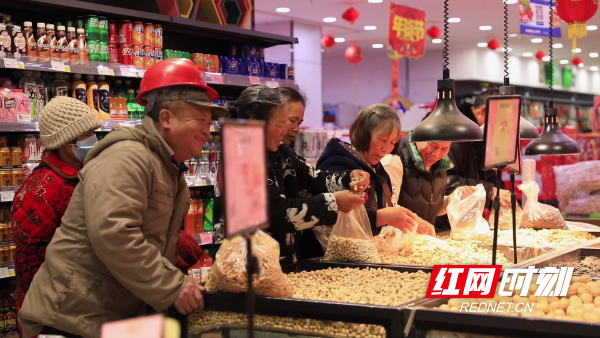 在江永县各大商超市场内节日氛围浓郁,从粮、油、肉、蛋、菜等生活必需品,到各类年货礼盒,再到各种饮品、糖果、零食,一应俱全,满足了市民多样化的购物需求。市民在各种商品间穿行挑选,浓浓的节日气氛让消费热度持续上升。