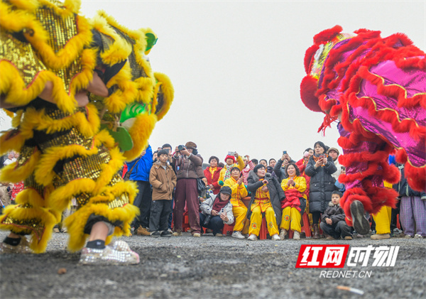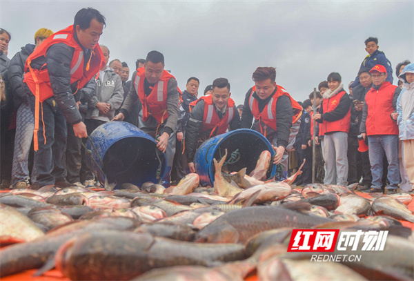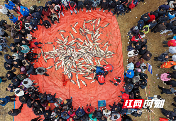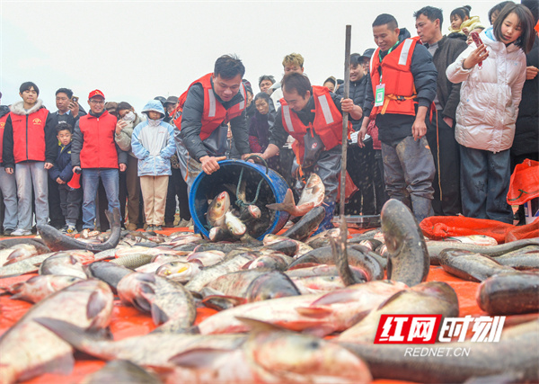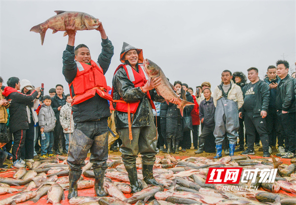 红网时刻新闻2月9日讯(通讯员 蒋克青)2月7日,湖南省永州市道县白马渡镇青口村,村民在捕鱼获。当日,道县举行首届“乡村捕鱼节”活动,通过干塘捕鱼、舞狮、舞龙等多彩年俗活动,吸引众多游客前来感受浓浓的年味,在欢乐中喜迎春节。