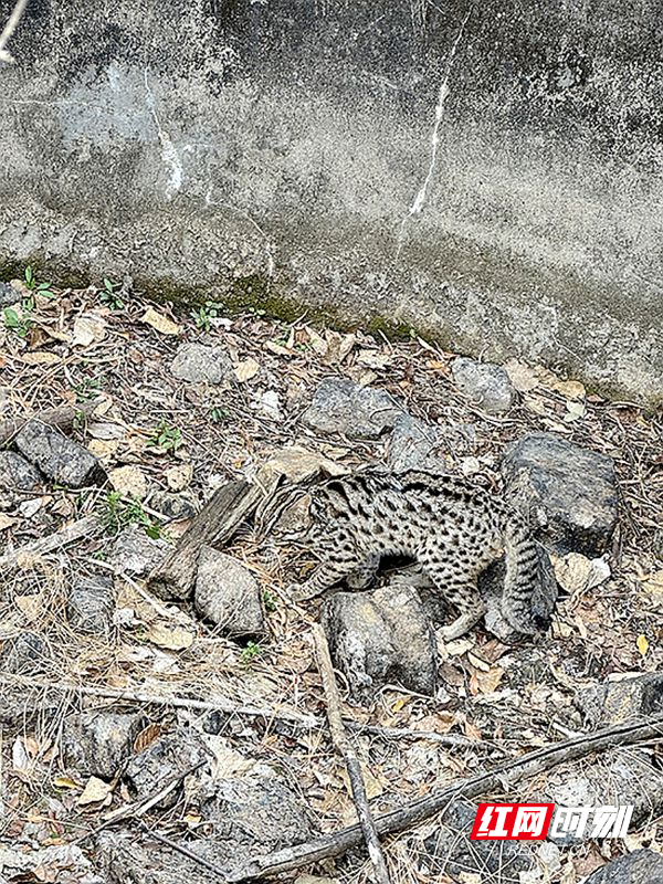 为尽快将豹猫救出,民警就地取材,迅速用木棒和棕树叶扎成一条简易“救援桥”,斜搭入池中。起初豹猫缩在角落警惕张望,在民警耐心地守候与轻声引导下,才小心伸爪试探攀爬。最终它敏捷跃上地面,迅速消失在附近树林中。