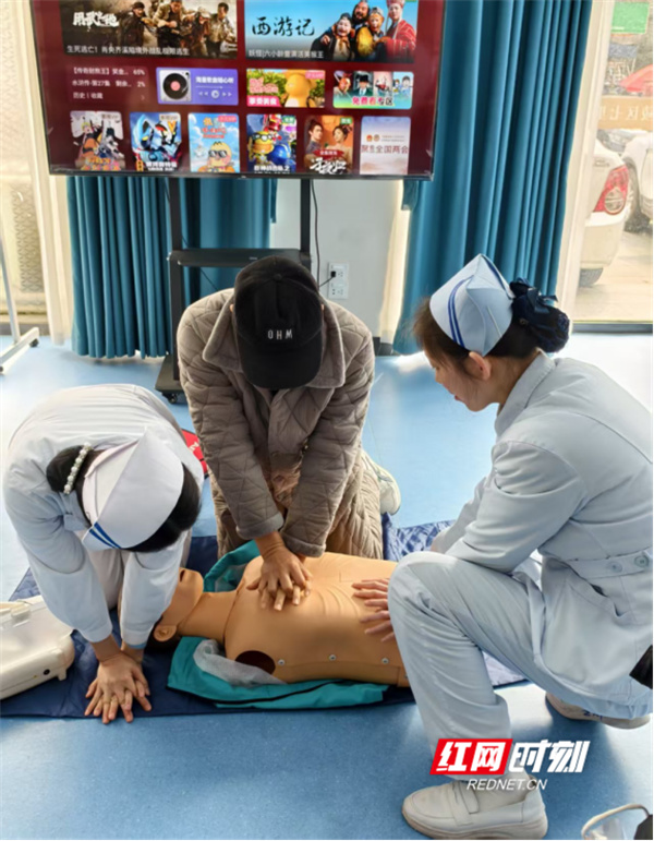 上午,零陵院区专家团队前往七里店社区卫生服务中心,通过“健康讲座+义诊”的形式开展活动。耳鼻咽喉头颈外科病区卢俊围绕《人工耳蜗植入社区科普宣传》讲座,结合国家人工耳蜗集采政策落地背景,讲解了人工耳蜗基础认知和植入流程,介绍了医院在该方面的手术能力。随后,护士长唐小辉以《老年人预防耳聋·科学保护耳朵》为题,阐述了老年性耳聋成因与预防措施;主管护师文玉华、曾筱禹通过理论讲解与模拟演示指导居民掌握心肺复苏技能,现场互动热烈。