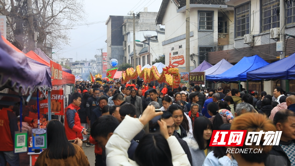 清晨,松柏乡主干道人流如织、锣鼓喧天,八方游客络绎不绝、喜气洋洋。舞龙舞狮、傩戏、腰鼓等表演轮番上阵,彩衣翻飞、鼓点铿锵,现场气氛热烈、掌声不断。集市沿街道绵延数里,农具种子、果苗农资、瑶家织锦、特色小吃琳琅满目,乡亲们精心选购、交易繁忙,处处呈现出一派热闹喜庆的春耕备耕景象。