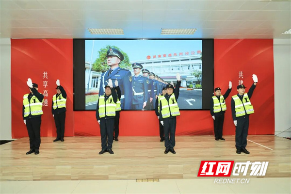 安顺公司总经理刘胜祥、潘市管理所所长颜映春等随即作表态发言,承诺将以此次活动为新起点,压实安全责任、细化防范措施,为分公司的安全稳定发展保驾护航。随后,在领誓人的带领下,全体人员举起右拳,庄严宣誓。铿锵有力的安全誓言,是对生命的敬畏,也是对社会的承诺。活动最后,一支由一线员工组成的方队上演了标准规范的交通手势指挥操。刚劲有力的动作、整齐划一的流程,将“安全规范”从理念外化为肌肉记忆,展现了湖南高速队伍严谨专业的“硬核”风采。