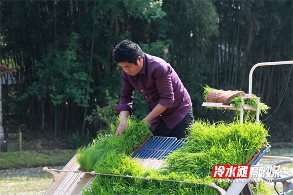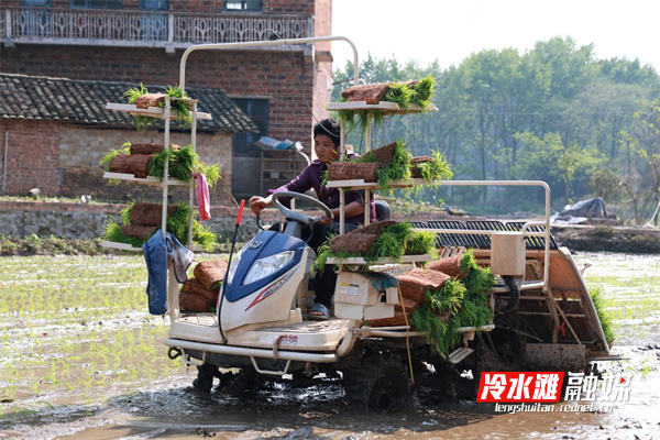 在冷水滩区牛角坝镇石溪江村水稻种植基地,一台台高速插秧机在平整的水田里来回穿梭,嫩绿的秧苗从苗盘上整齐滑落,稳稳插入泥土中,一行行秧苗笔直挺立,为稻田披上了绿色“新装”。
