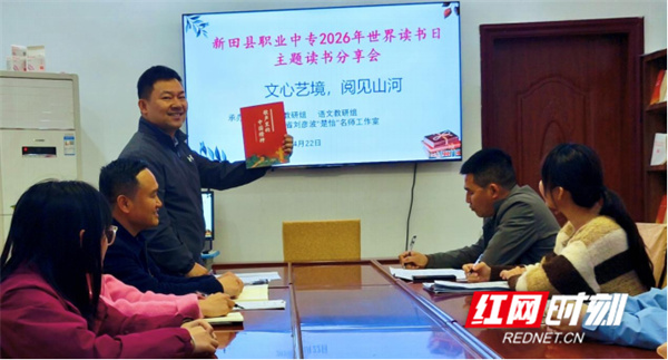 红网时刻新闻4月26日讯(通讯员 张琳 周鑫荣)4月22日,新田县职业中专开展了以“文心艺境、阅见山河”为主题的读书分享会。本次活动由艺术教研组、语文教研组及刘彦波名师工作室联合举办,以书为媒,共话教育,共促成长,旨在促进不同专业背景的教师进行跨学科、跨领域的交流,共同推进“校长喊你来歌唱”品牌活动的持续开展。