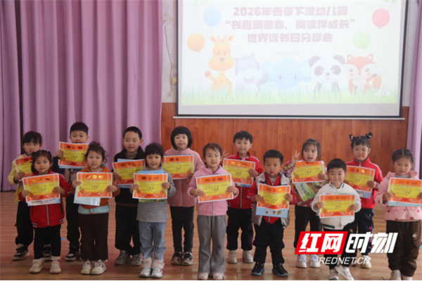 红网时刻新闻4月26日讯(通讯员 夏艾萍)为迎接第29个世界读书日,营造浓郁的校园书香氛围,让孩子们在阅读中收获快乐、在分享中展现自我,4月23日,宁远县下灌幼儿园以“书香润童心,阅读伴成长”为主题,成功举办世界读书日阅读分享会活动。全体幼儿与教师齐聚一堂,用动听的故事、真挚的分享,共同开启一场温馨美好的阅读之旅。