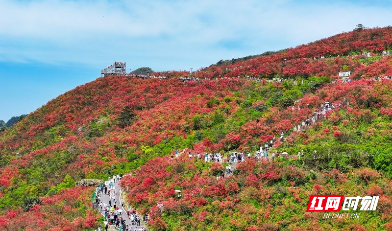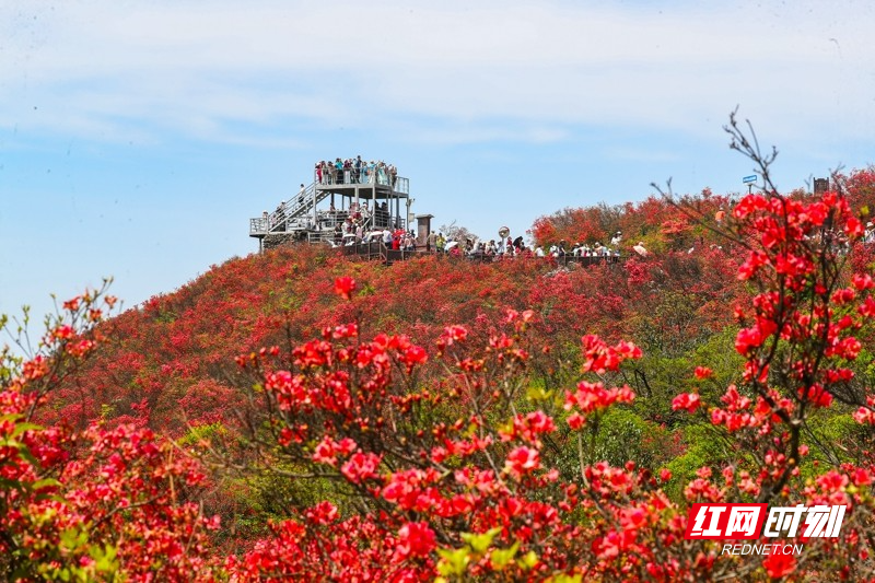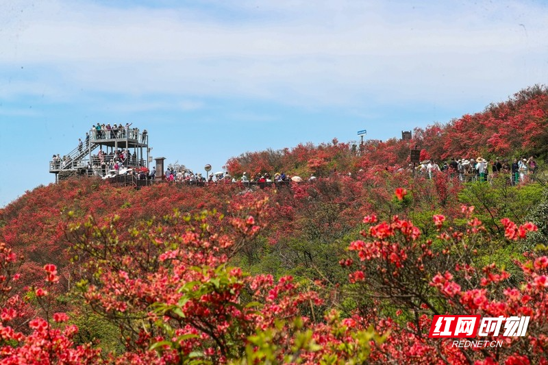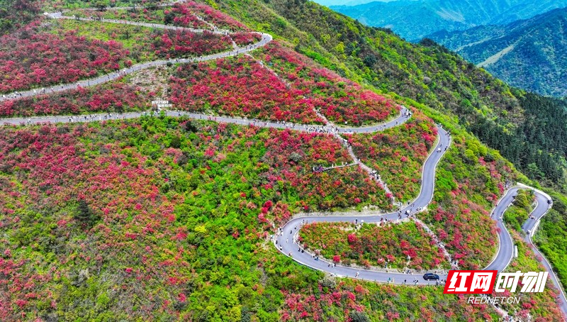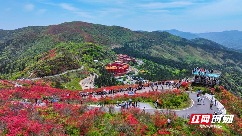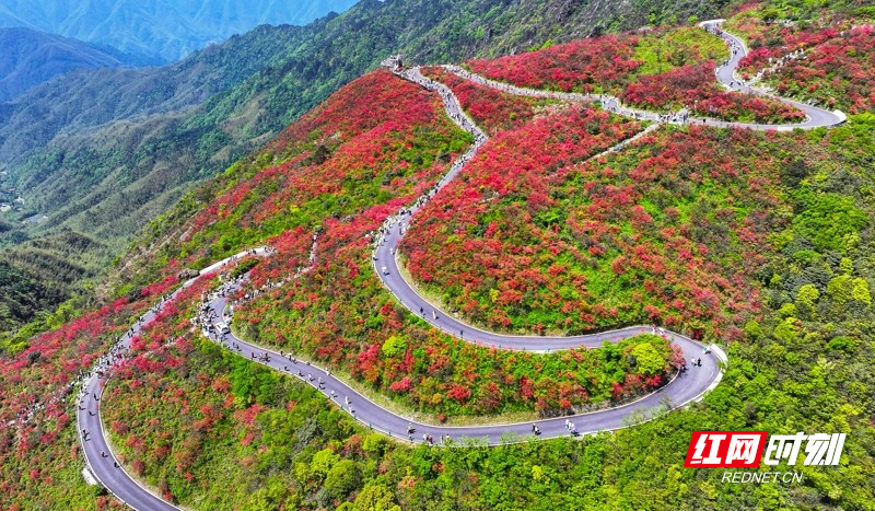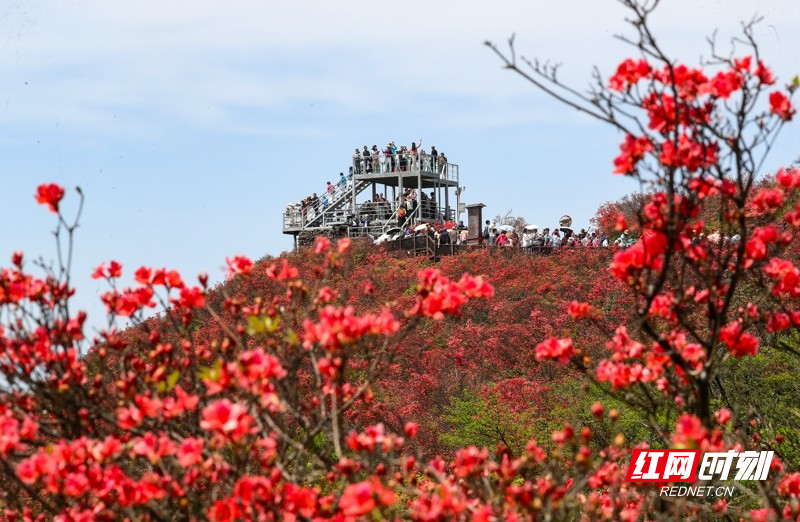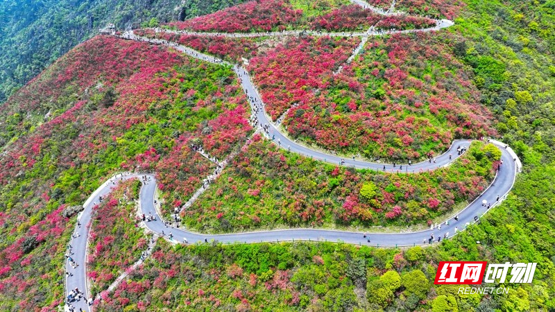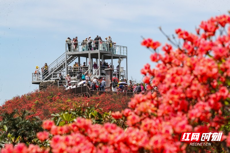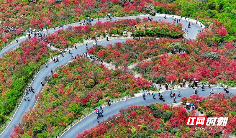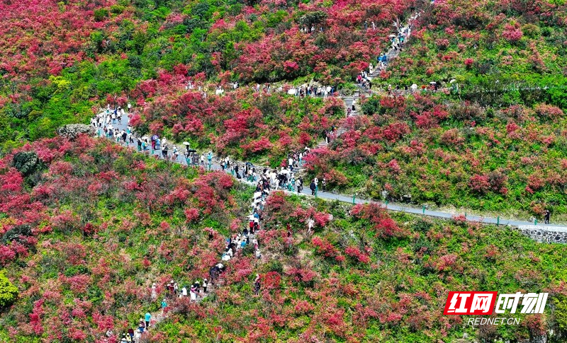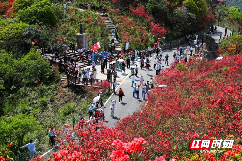 红网时刻新闻4月27日讯(通讯员 刘贵雄 陈祉凝)4月26日,游客在湖南省永州市双牌县阳明山国家森林公园赏花游玩。近日,湖南省永州市双牌县阳明山国家森林公园内近十万亩野生杜鹃花竞相绽放,漫山盛开的杜鹃花绚烂如霞,吸引众多游客前来赏花游玩。