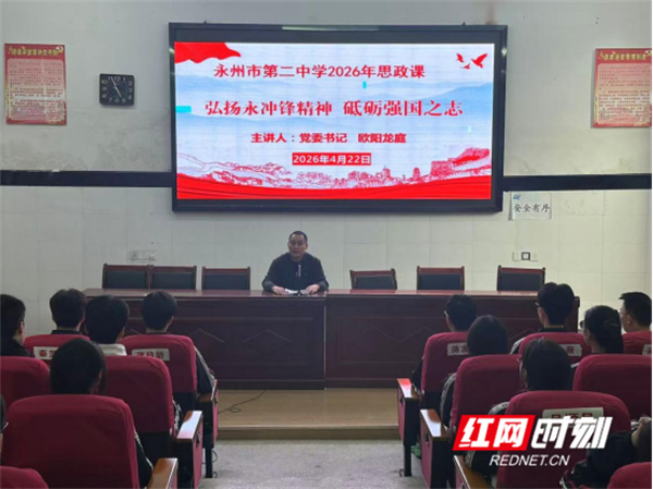 红网时刻新闻4月28日讯(通讯员 张云云 蒋雨姗)为推进思政课一体化建设,日前,永州市第二中学在阶梯会议室开展2026年度第一堂思政课。本次课程由党委书记欧阳龙庭主讲,围绕“弘扬永冲锋精神,砥砺强国之志”为主题展开。
