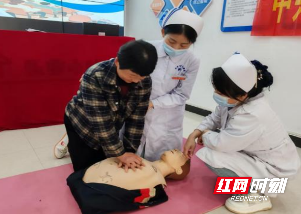 急救演示环节,主管护师熊思娟与孙璐现场讲解并指导居民练习心肺复苏和海姆立克急救法的操作要点。