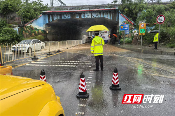 4月20日下午16时许,暴雨突袭,永州市冷水滩城区多条道路漫水,冷东快线路段涵洞出现大量积水,驾驶人开进之后,易造成车辆熄火滞留,珊瑚中队及经开区中队立即安排警力,前往现场开展应急处置,并对积水路段实行临时交通管控,劝导驾驶人绕行其他路段。同时,大队第一时间启动恶劣天气道路交通应急预案,针对辖区积水路段开展远端分流、近端疏导及积水区域救援,同步做好隐患排查、事故防控工作。在积水路段、易拥堵路口,随处可见身着雨衣的民辅警开展交通疏导,叮咛提醒行经积水区域的驾驶人,也传递一份特殊时段的关怀与温情。
