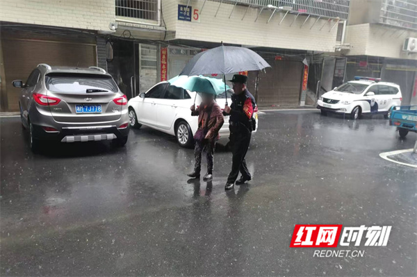 4月20日,祁阳市迎来持续强降雨,瓢泼大雨席卷全城。当日9时36分,祁阳市公安局巡特警大队2号快警平台接到110指挥中心指令:金果小区内有一位老人不慎跌倒在地,情况不明,急需救助。值班民警廖中文立即带领执勤辅警携带急救装备、雨伞等物资,迅速驱车赶往现场。廖中文等人抵达指定地点后,远远便看到一位老人侧躺在路边。民警迅速下车,拿出携带的雨伞为老人撑开,同时轻声安抚老人情绪,避免其因紧张引发身体不适。民警询问老人基本信息并确认老人身体没有大碍后,将老人安全护送回家。