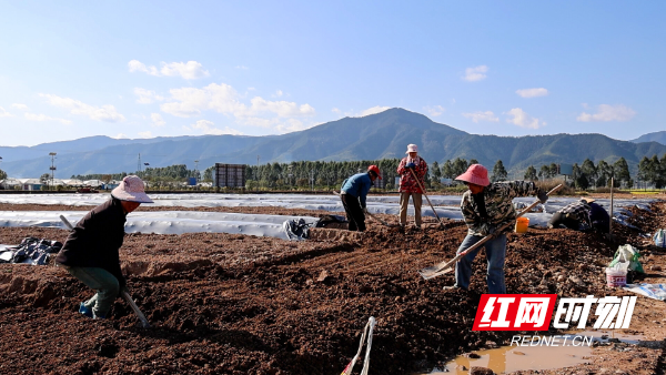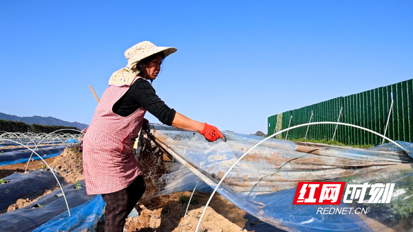 在新扩基地,挖掘机来回作业、机械轰鸣,基地负责人张永正带着村民撒施有机肥、清沟松土、规整田块,抢抓农时改良土壤、培肥地力。另一边,村民们细心为蔬菜幼苗覆盖地膜,保障苗期生长。