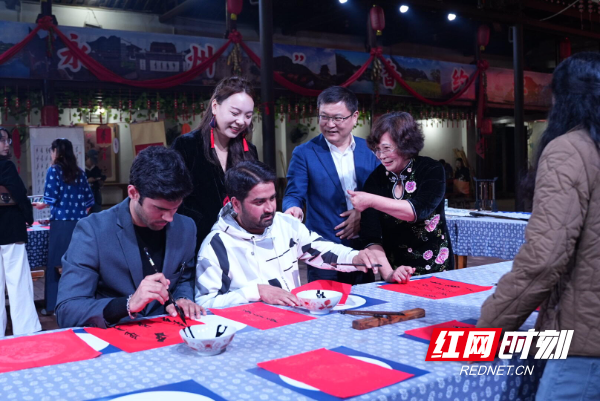在女书生态体验馆,外国专家们在讲解中系统了解了这一世界唯一的女性专用文字,对传统字符与现代创意融合的文创产品表现出浓厚兴趣,纷纷驻足交流。在随后的书写体验环节,大家在女书传承人指导下执笔临摹,于一撇一捺间亲身感受女书的字形之美与文化温度。