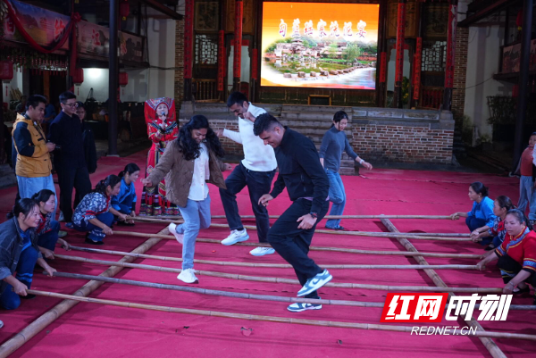 活动中,专家们参与了富有瑶族风情的洗泥宴,席间欣赏了原生态歌舞表演,并踊跃加入竹竿舞互动。在欢快的节奏中,中外双方携手共舞,现场气氛热烈融洽,欢声不断。