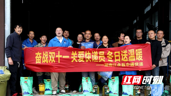 江永中通快递员邓伯原笑言:“天越冷,心里越热乎。公司送来新棉衣、米面油,浑身是劲儿!今年不光送快递,也头回当回‘收货人’。”