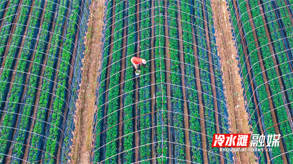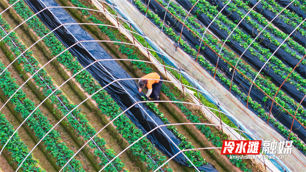 在冷水滩区珊瑚街道水汲江社区草莓种植基地,农户们穿梭田间为草莓苗覆盖保温膜。这样既能锁住土壤水分、抑制杂草生长,又能抵御冬日低温侵袭。