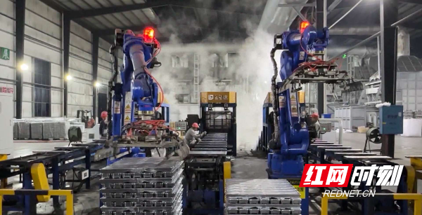 在江永县产业园区的永州市中新铝业有限公司生产车间内,一条条自动化生产线正满负荷运转。铝液经过打渣、冷却、码垛等工序,变成一块块光亮的铝锭,等待发往全国各地。