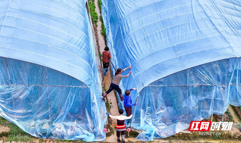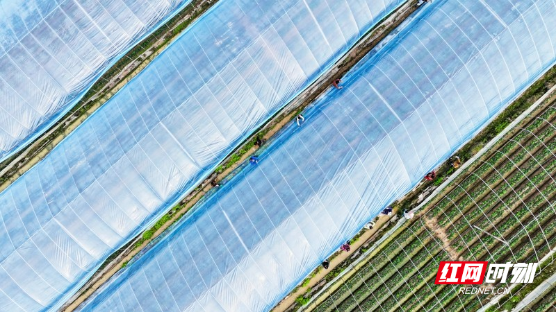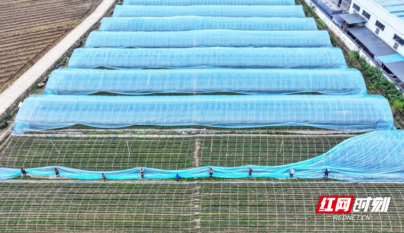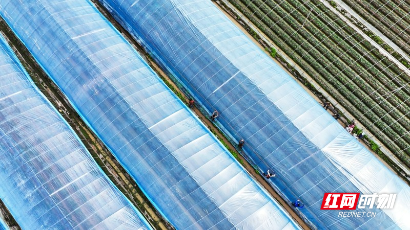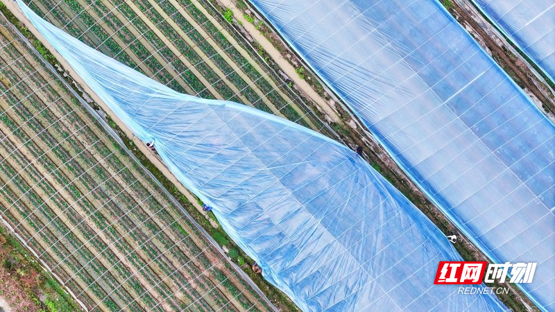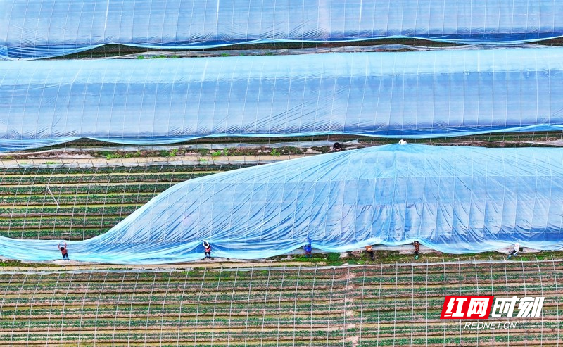 红网时刻新闻11月7日讯(通讯员 刘贵雄)2025年11月7日,湖南省永州市新田县中山街道潭田村草莓种植基地,农民正在给大棚盖膜,确保草莓安全越冬。当日是立冬节气,当地农民抢抓农时做好采收、御寒、管护等工作,田间地头一派繁忙景象。